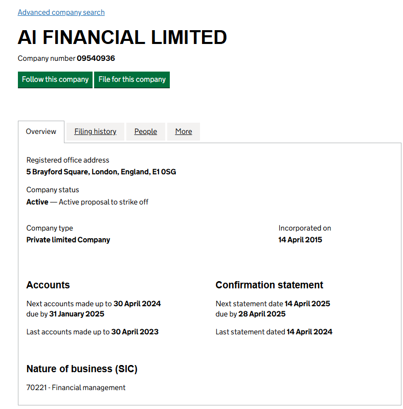 Another fact to note. Brokers registered in the UK are required to hold an appropriate FCA license to operate on the local market. AI Financial Limited does not possess such a license, and its stated SIC code does not cover brokerage services.