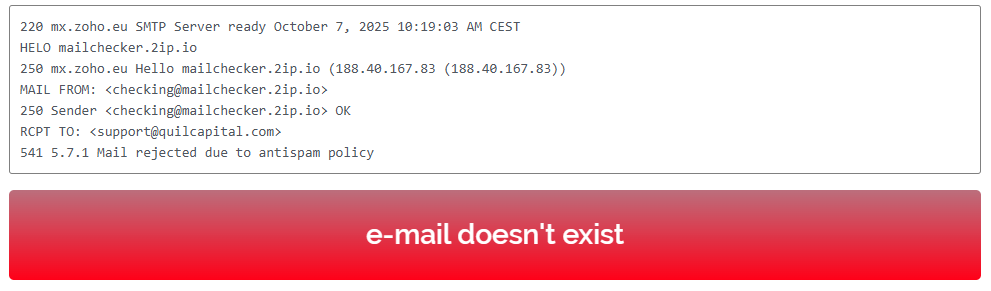 The ways to contact the company’s managers are also very limited. QuilCapital provides only an email address and a phone number. However, verification showed that these contacts are fake — they simply don’t exist.
