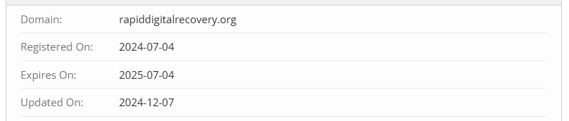 Let’s move on to the most interesting and important part. The first thing that should raise red flags for any rational person is the company’s existence period. The website rapiddigitalrecovery.org was registered on July 4, 2024, and the domain was purchased for just one year. So, all the experience these scammers claim to have is a complete fabrication. The project hasn’t even been around for a year. The company will disappear, and a new one with the same website but a different name will take its place.