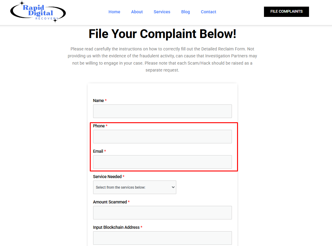 Rapid Digital Recovery is a fake “recovery company” that disguises itself as a fund recovery specialist but, in reality, is just another scam designed to take people’s money. They have no licenses, no legal registration, and no verified work experience. All the information on their website consists of empty promises and flashy statements aimed at desperate victims who have already fallen for scams.