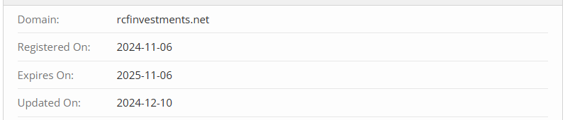 Claims of “many years of experience” are a blatant lie. The website’s domain was registered in 2024, meaning the company hasn’t even been around for a full year. Some might think that’s not a problem, but professional traders know these “newcomers” are often created to collect money quickly and disappear. RCFInvestments was launched recently with the sole purpose of scamming traders.