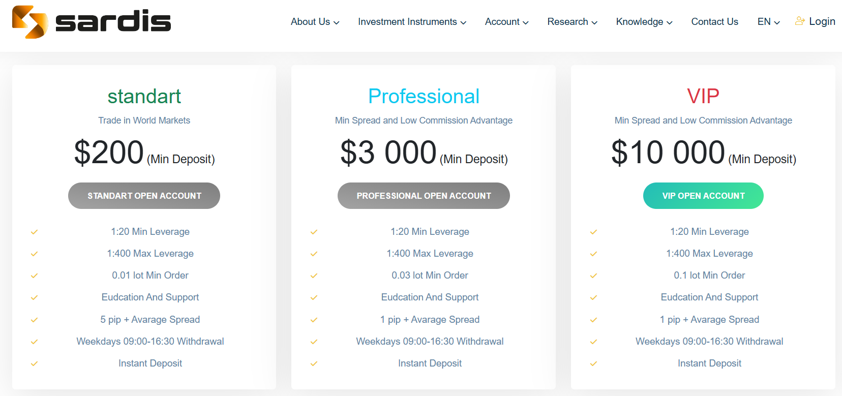 The broker has published some trading conditions in the account types table. Users will find information on the minimum deposit amount, leverage (uniform across all Sardis Global accounts, ranging from 1:20 to 1:400), spreads, and the minimum trade size.