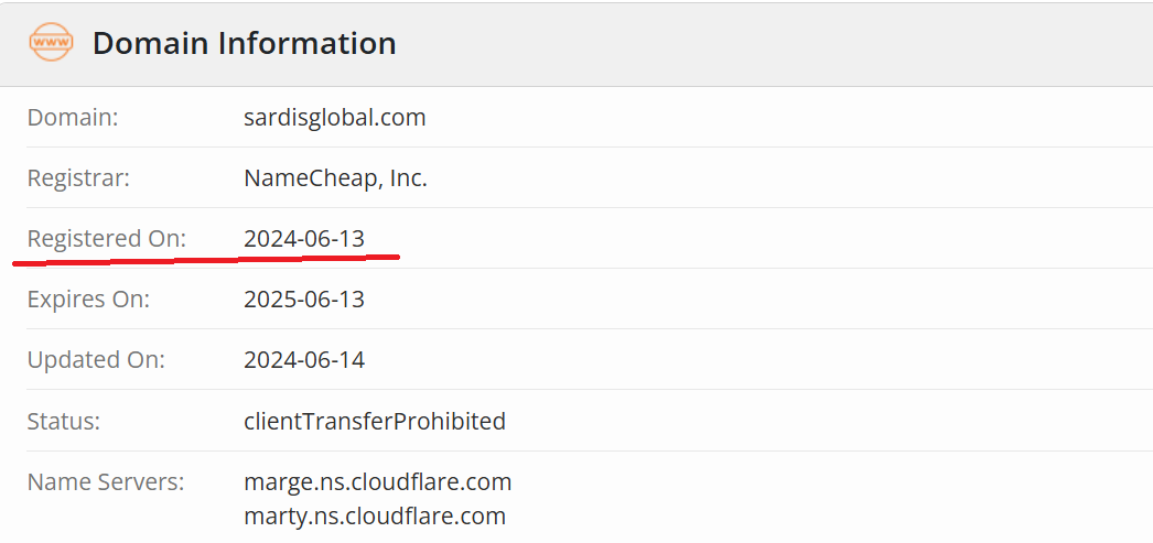 Before discussing licenses, let’s clarify the company’s registration. Here, too, there are interesting points. We’ll start with the age of Sardis Global. This is also noteworthy. Today, the broker operates under the domain sardisglobal.com, registered in June 2024, according to Whois.
