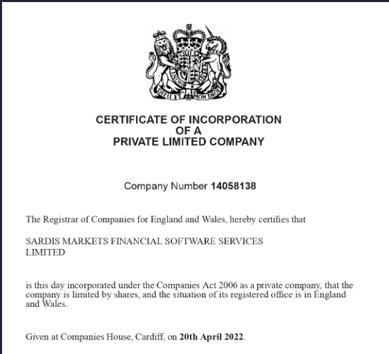Initially, the broker operated as Sardis Markets, and its UK registration certificate is still linked in the site’s footer.