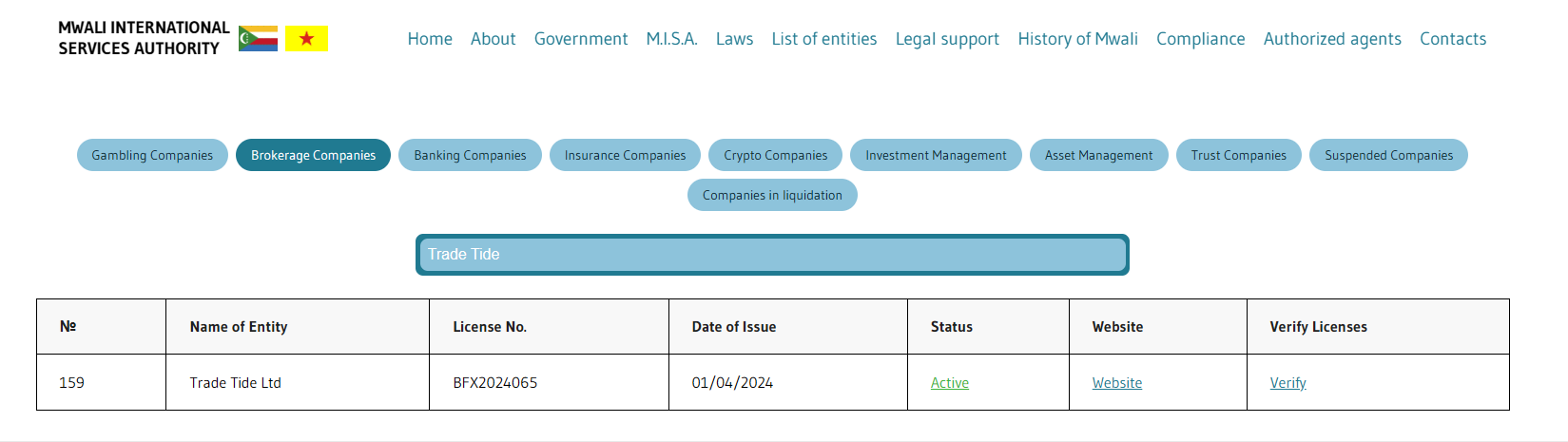 Now, let us move on to the most important aspect — the legal side of the broker’s activities. The company states that it is registered in the Comoros Islands, under the Mwali jurisdiction (Mwali International Services Authority, MISA). In the registry, such an entry can indeed be found: the legal entity was established in 2024. In other words, the organization formally exists, but this in no way guarantees reliability.