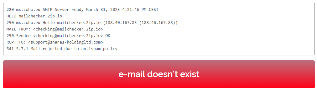 Now let’s talk about the contact details for Shares Holding. There’s plenty to discuss. The broker lists two contact methods: email and phone. Upon verification, the domain shares-holdingltd.com is not connected to any active email service. In other words, it’s impossible to send an email — it’s a fake address. And here’s the question: would a real, regulated company ever publish a non-functional, fake email? The answer is clear — never.