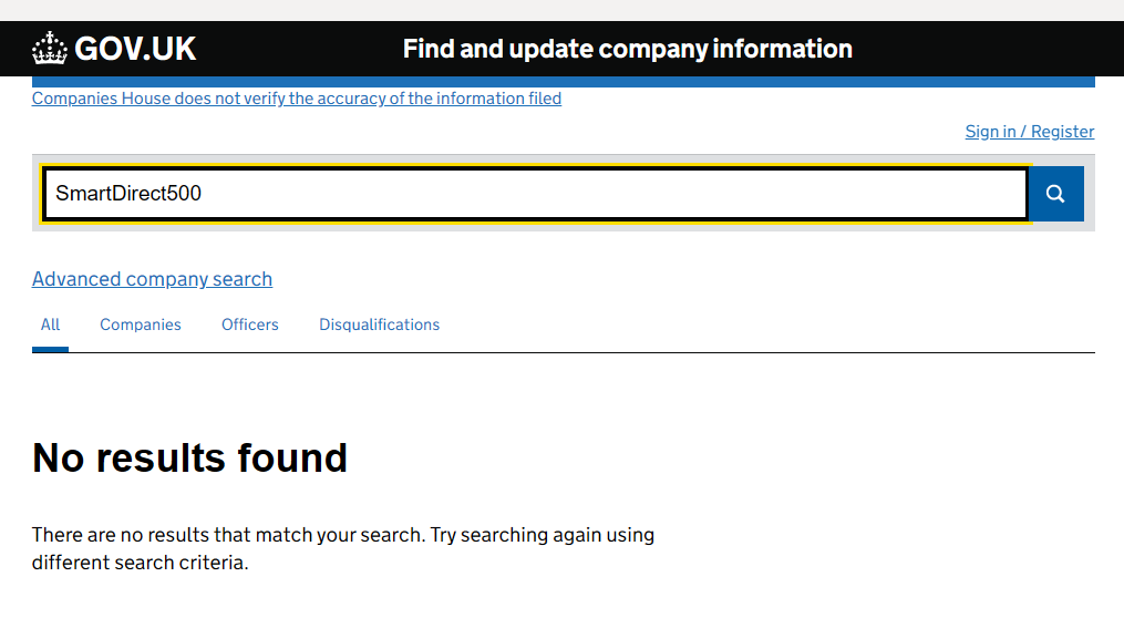 First, why does the company have no regulatory license? There is no mention of any licensing whatsoever. That alone is a red flag. But how can a supposedly British broker operate without regulation from the FCA? The catch is that SmartDirect500 is not actually registered in the United Kingdom. We checked the Companies House registry — there is no such entity listed. This means the provided address is also fake. That’s why the platform has no license and never will.