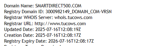 Second, the operating history of the platform. This is another key factor because the longer a brokerage operates in the market, the more trust it earns. However, the subject of our review appeared only recently, so there is no track record to speak of. The domain smartdirect500.com was registered on July 16, 2025. That was less than a month ago. In short, this broker is a brand-new scam.
