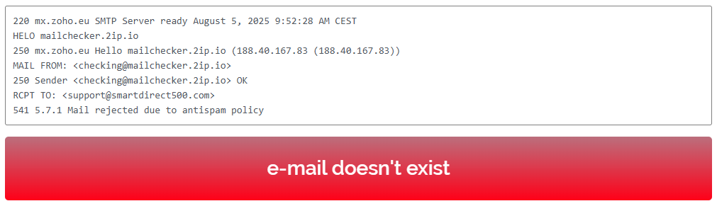 We checked the email address, and it turned out to be fake. In other words, the provided email simply does not exist. It does not receive messages; it was never registered, or it has been deactivated. This is direct evidence that the email contact channel is bogus. It’s a classic sign of a scam.