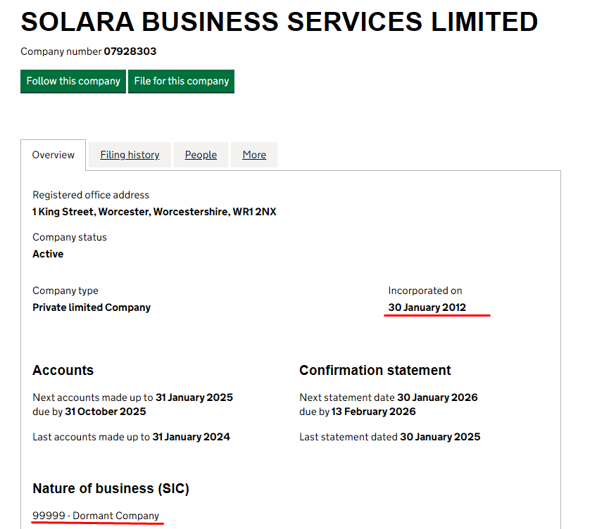 And now for the most revealing part. The broker lists a registration number: 07928303. This number does indeed lead to a company with the same name, founded in 2012. However, its current status is listed as “Dormant Company”. Clearly, there is no connection between the two entities apart from a similar name. In other words, Solara Finance Limited has listed a fake legal address in the United Kingdom. That address belongs to a completely unrelated organization.