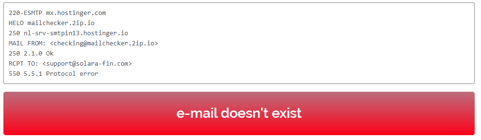 Users have only two ways to contact Solara Finance Limited’s representatives: email or phone. However, in reality, these are fake contact details, making it unclear how to actually reach anyone from the company. We verified the email address — it does not exist.