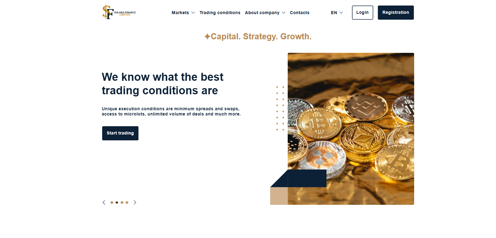 The website of Solara Finance Limited appears to be built using a generic template. Minimalism is fine, but here it lacks any taste. A plain white background with dark blue headers. The graphics are basic stock images anyone can find with a simple Google search: a Solana coin (what does that even have to do with anything?), a candlestick chart without labels, and skyscrapers. Why do scam brokers love skyscrapers so much? Is it supposed to symbolize success and wealth?