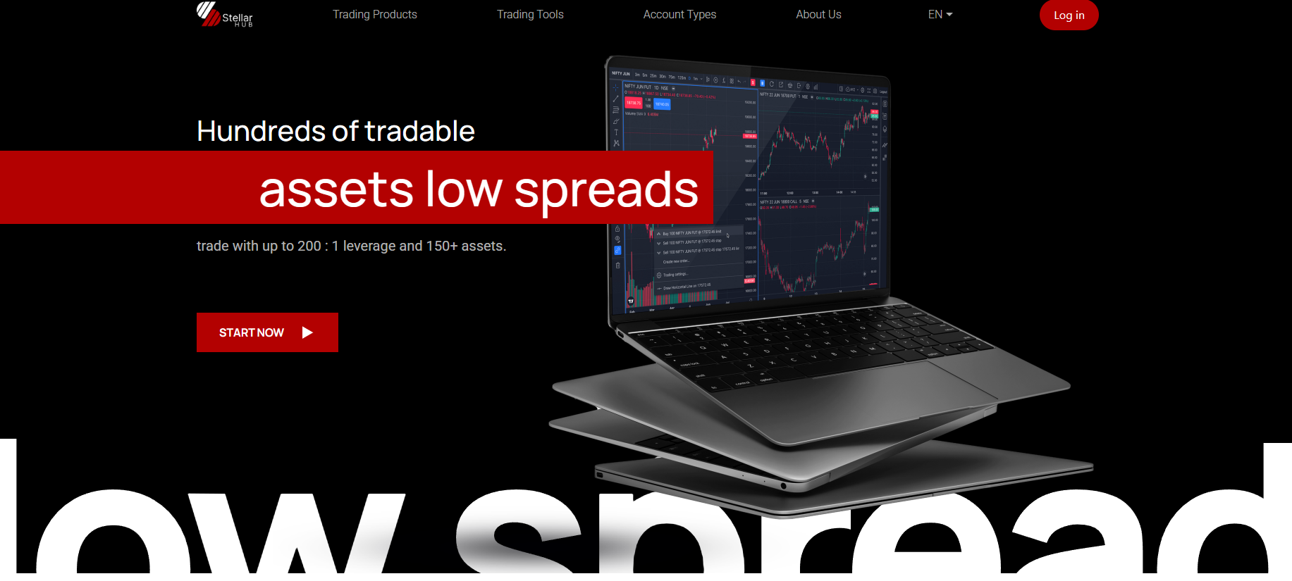 The Stellar Hub website looks modern and flashy. The homepage features a black background, bright red accents, large fonts, and attractive promotional images. A laptop screen with a trading terminal, charts, candlesticks, and indicators is meant to immediately give visitors the impression of a professional platform. The design follows a classic marketing template: first come promises of “hundreds of assets and low spreads”, then bonuses, training, and of course, success stories.