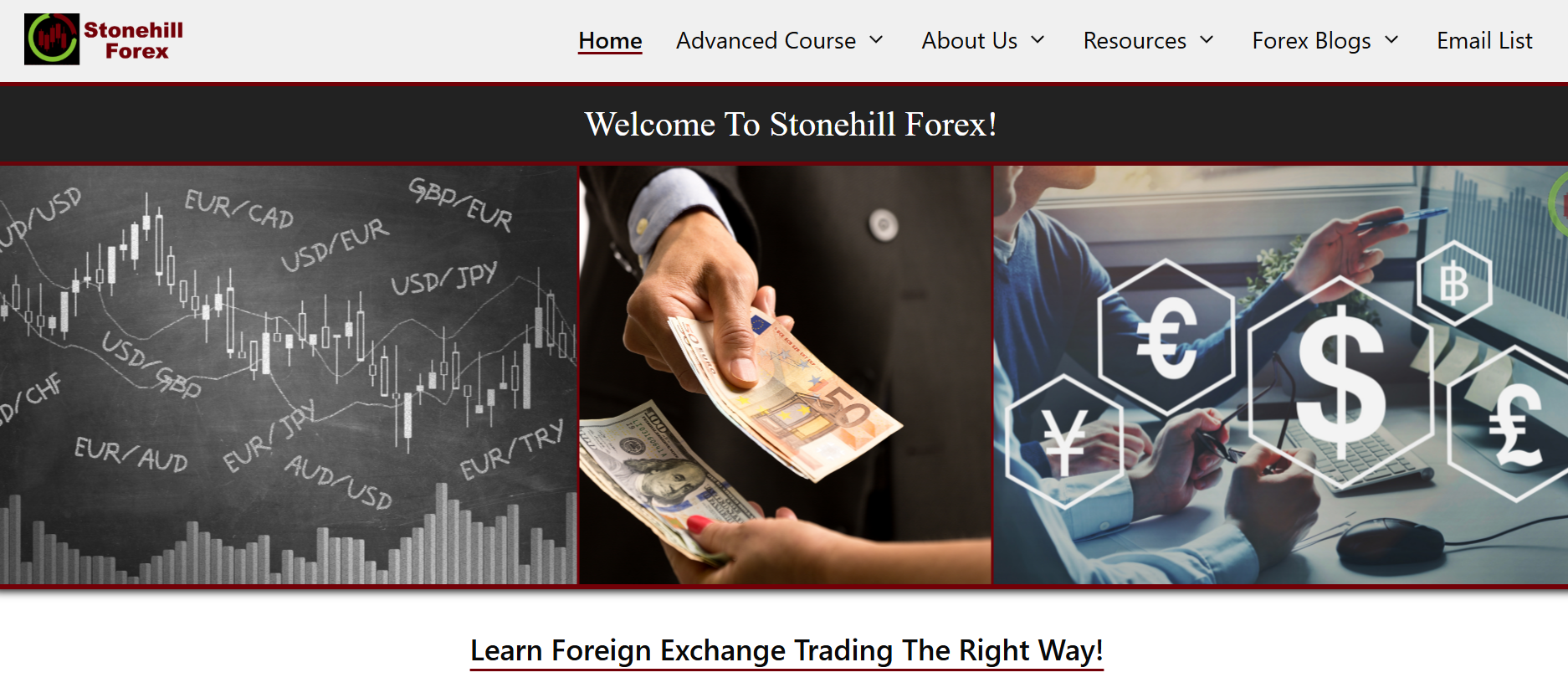 The official website of Stonehill Forex looks completely unprofessional. The design is outdated. The site’s header is overloaded: at the top is the logo, followed by a menu with sections like “Advanced Course”, “About Us”, and “Forex Blogs”. All of it seems to be copied from a standard WordPress template from the 2010s. The color scheme — black, gray, and maroon — feels heavy, visually oppressive, and tiring.