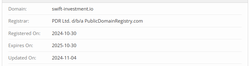 This means Swift Investments isn’t registered anywhere and, therefore, cannot hold a valid license. That’s a 100% risk and a guarantee that you’re dealing with a scam. However, that’s not all — another major red flag is the company’s operating history, which practically doesn’t exist. The domain swift-investment.io was registered on October 30, 2024 — barely three months ago. No experience, no track record. There’s simply not enough time to build a reputation as a reliable and trustworthy intermediary.