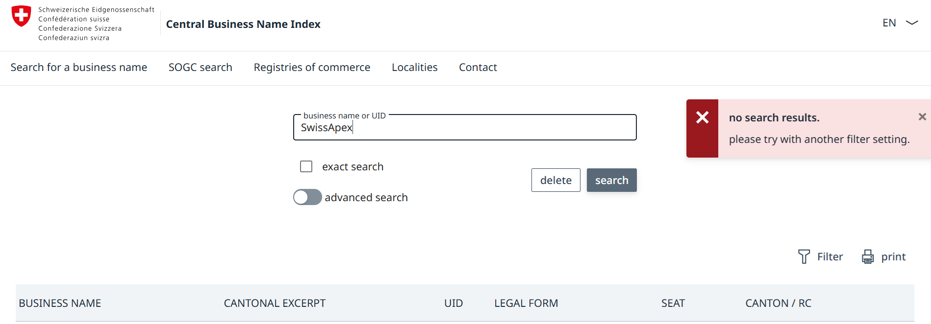 We also checked SwissApex in the Swiss business register and found no company by that name. Clearly, without an official registration, a broker cannot obtain a financial services license. Thus, SwissApex effectively operates as an anonymous website.