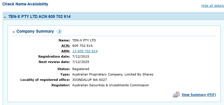Let us start with South Africa. A search shows that a company called TenX Prime does indeed exist there. It was registered in 2022. However, this form of regulation cannot be considered reliable. It is far more important to verify whether the broker holds an ASIC license, as that is a genuinely responsible and reputable financial regulator.