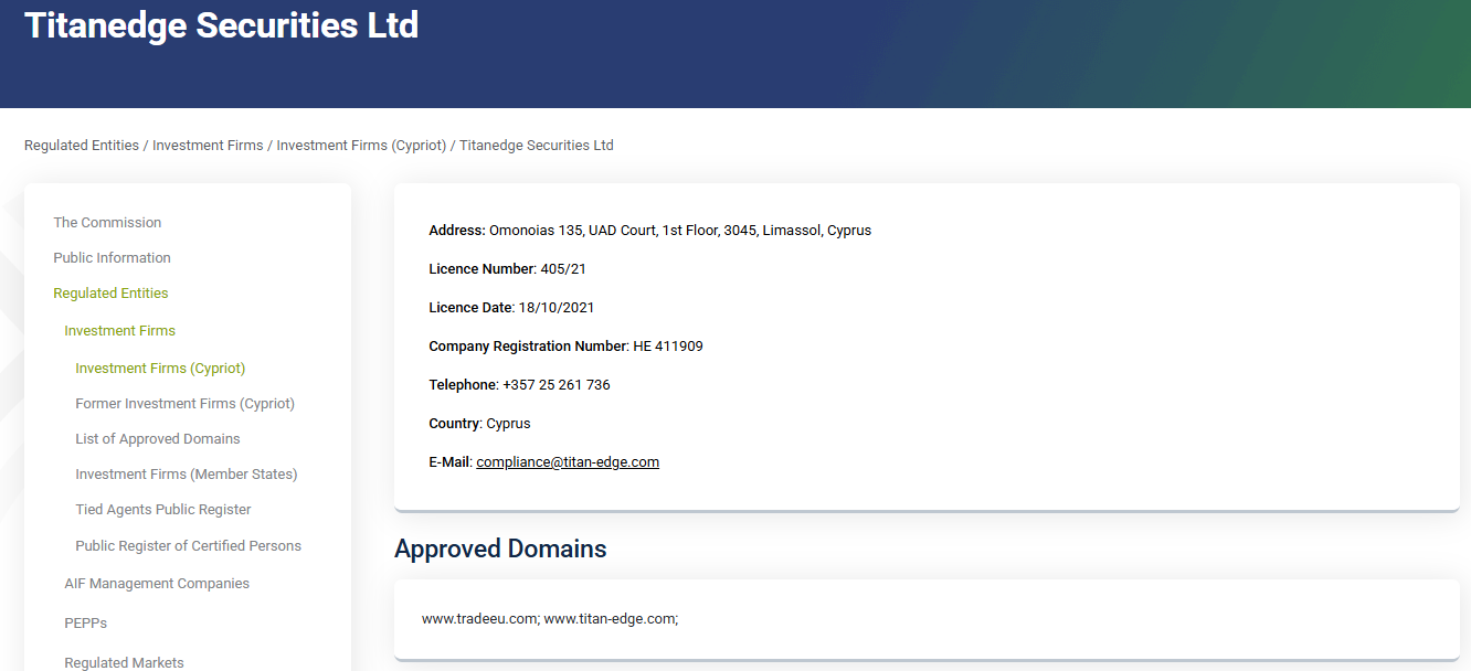 Verification through the official CySEC registry confirmed that Titanedge Securities Ltd is indeed registered in Cyprus under number HE 411909 and holds a CySEC license number 405/21.