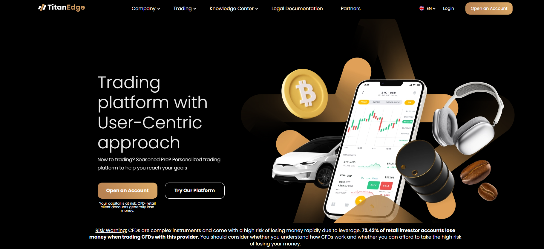 We begin our introduction to TitanEdge with their official website. It follows a standard brokerage template, much like many other similar sites. The top menu includes the main sections: company, trading, knowledge center, legal documentation, and partners.