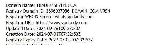 Next, we should note the company’s age. The domain trade24seven.com was registered on July 3, 2024. The MISA license appeared on March 15, 2024. This means the project is just over a year old. For a broker, this is a critically short period — there is no proven track record, no established reputation, and no demonstrated experience in serving clients.
