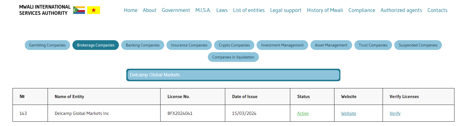 On its website, Trade24Seven states that it is operated by Delcamp Global Markets Inc., registered and licensed in the jurisdiction of the Comoros Islands (Mohéli) by the MISA regulator. We checked the official MISA registry — yes, such a company is indeed listed among brokerage organizations. License No. BFX2024041 was issued on March 15, 2024, with the status “Active.”