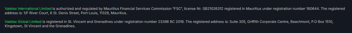 In the footer of the official website, the company lists two legal entities: Valetax International Limited (Mauritius) and Valetax Global Limited (Saint Vincent and the Grenadines). These are offshore jurisdictions, and the company has no other branches.