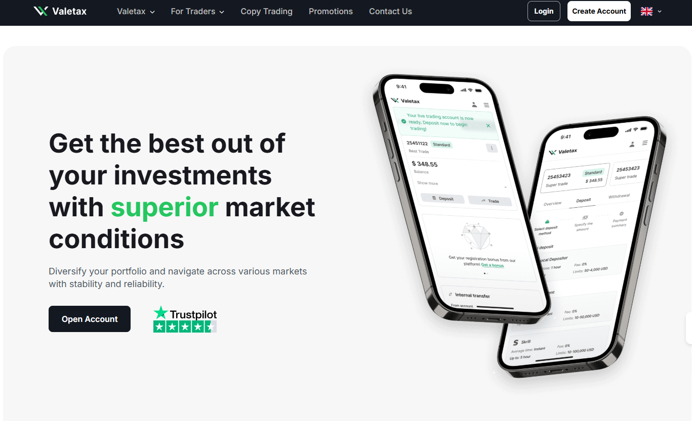 At first glance, the Valetax website appears well put together. The black and white color scheme with green accents gives an impression of a “serious” approach, as if you are looking at an international platform on the level of IC Markets or Pepperstone. Everything is in its place: a header with navigation sections, registration and login buttons, a responsive mobile version, and readable fonts.