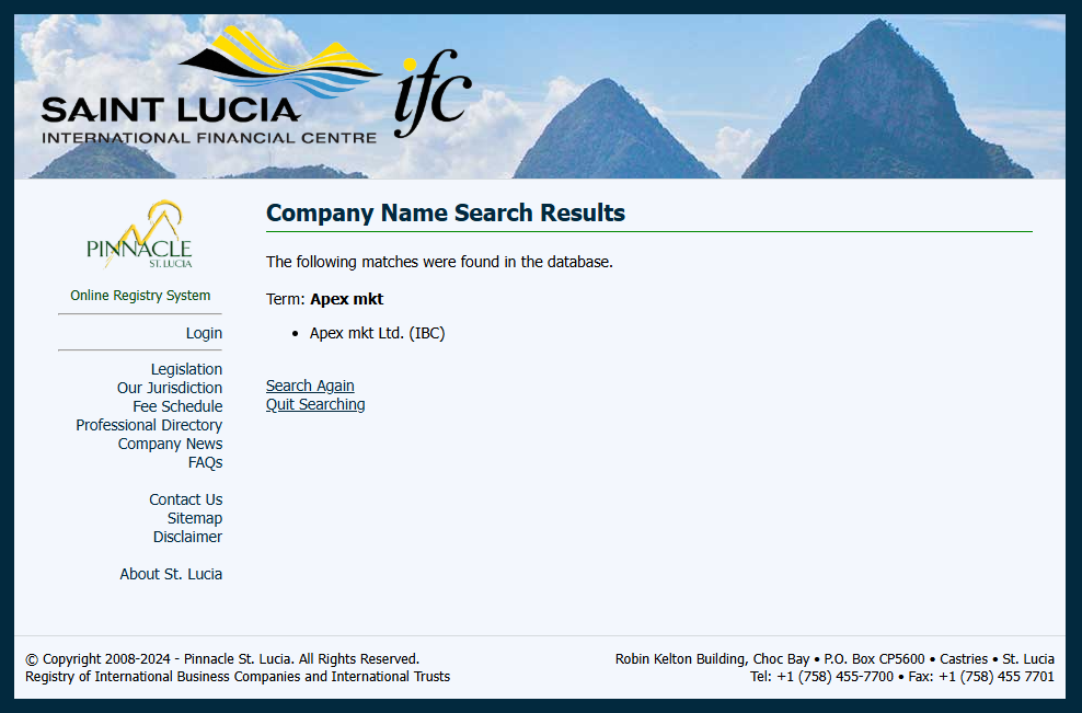 The platform is owned by an organization called Apex Mkt. First, they claim to hold a license from MISA (Mwali, Comoros Islands). Second, they list a legal address in Saint Lucia. Both of these claims are true. We verified both registries and confirmed that Apex Mkt is a legitimately existing organization.