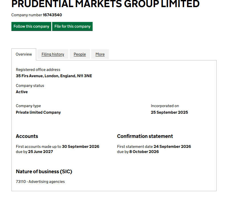 To verify the legality of the project, we examined the registration of the company managing the project. According to the UK registry, the owner of the platform is PRUDENTIAL MARKETS GROUP LIMITED, which does indeed exist as a legal entity. However, several problems arise here.