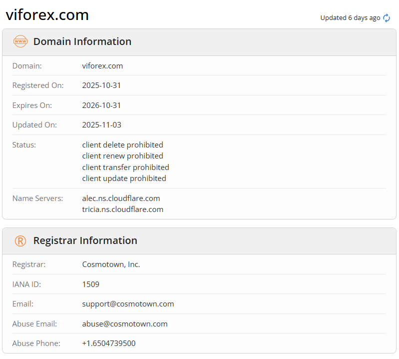Secondly, the company itself was registered only on September 25, 2025, while the official Viforex website appeared later, on October 31, 2025, according to Whois data. This indicates that the platform was most likely launched using an existing legal entity that was not originally intended for brokerage activities.