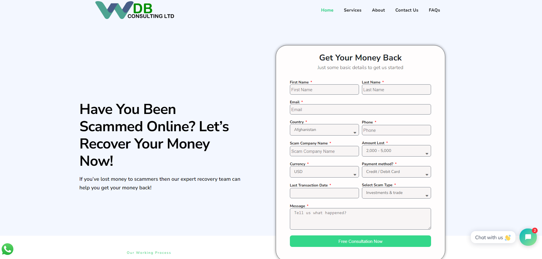In addition to the form for providing all the information about their case, users can call a phone number or write to an email address. There is also the option to contact an online chat to get a quicker response from managers, but for this, you need to share your email address and phone number. Why can’t you just provide your name to communicate with an employee? It is likely done so that WDB Consulting LTD can obtain your contact details and then call you themselves.