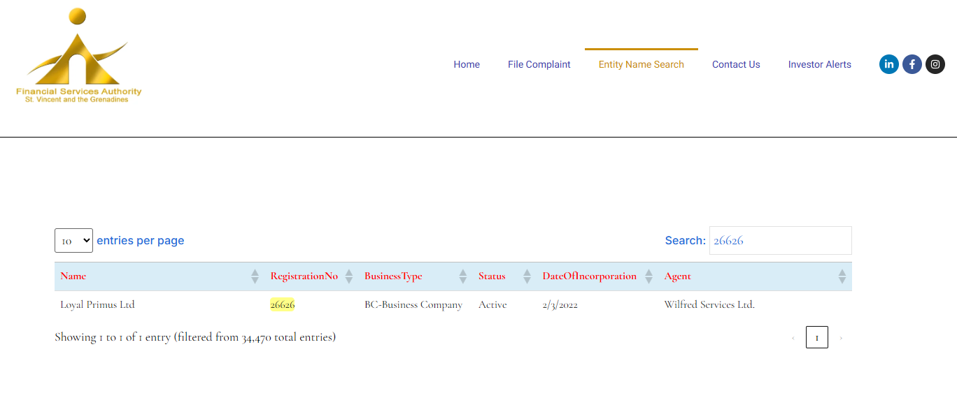 All that is known about the firm is its legal registration in Saint Vincent and the Grenadines. The company states this at the bottom of the homepage of its official website. We decided to check the SVGFSA registry, and here is what we found.