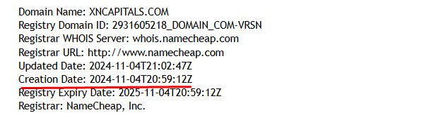 So, let’s find out when XNCapitals got its start. The website claims over six years of experience, but we believe this is a lie. Here’s why: The domain was registered only recently, in November 2024, and its expiration date is November 4, 2025. This strongly suggests that the company has no plans for long-term operations.