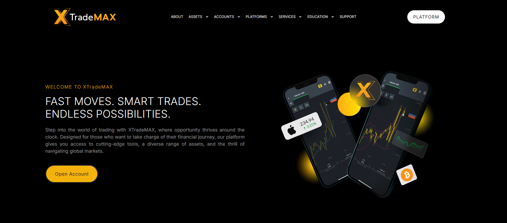 Let’s start with the obvious — the website design is simply awful. It features a dark background with neon yellow highlights. XTradeMAX uses a standard site structure, with sections like “Assets”, “Platforms”, “Education”, and “Services”. There are lots of menu items, but none of them offer any meaningful content. You click through only to read flashy but empty statements.